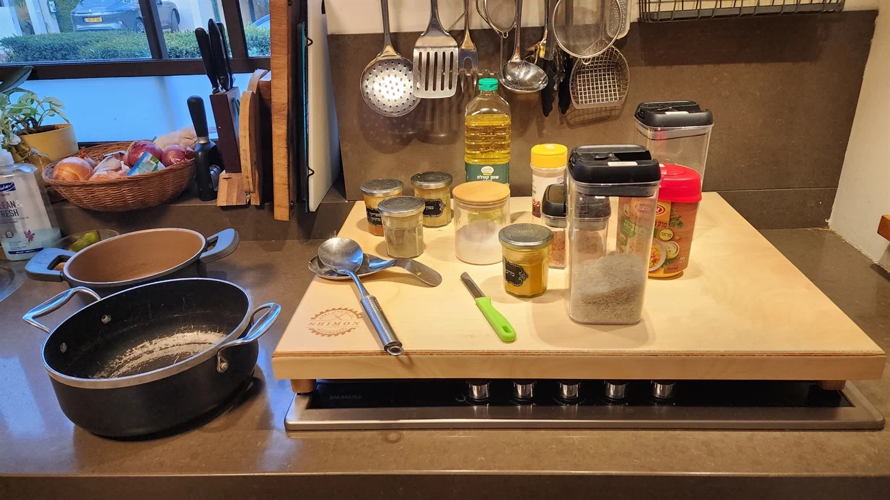 משטח העבודה לכיריים נוצר מתוך מחשבה על ניצול חכם של חלל, בשילוב חומר טבעי ואסתטיקה נקייה. הוא מונח מעל הכיריים והופך אותן, ברגע אחד, למשטח עבודה רחב, יציב ונעים לשימוש – מבלי לפגוע בקווי העיצוב של המטבח.